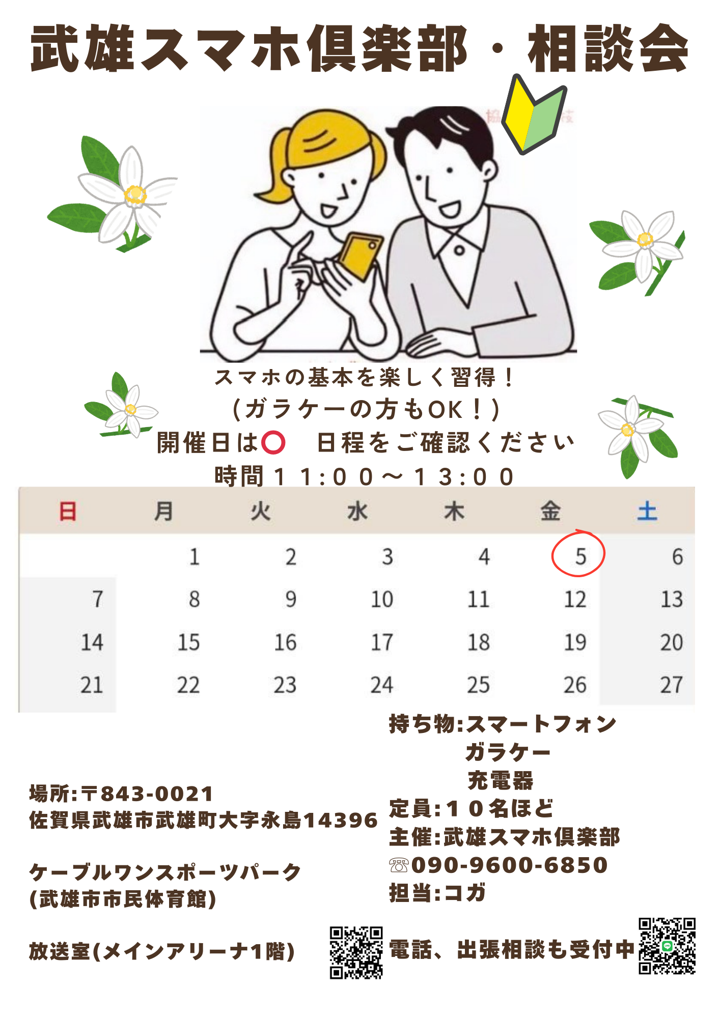 | 12/5(金) | 武雄ケーブルワンスポーツパーク(11:00~13:00) | 第7回スマホ教室 |